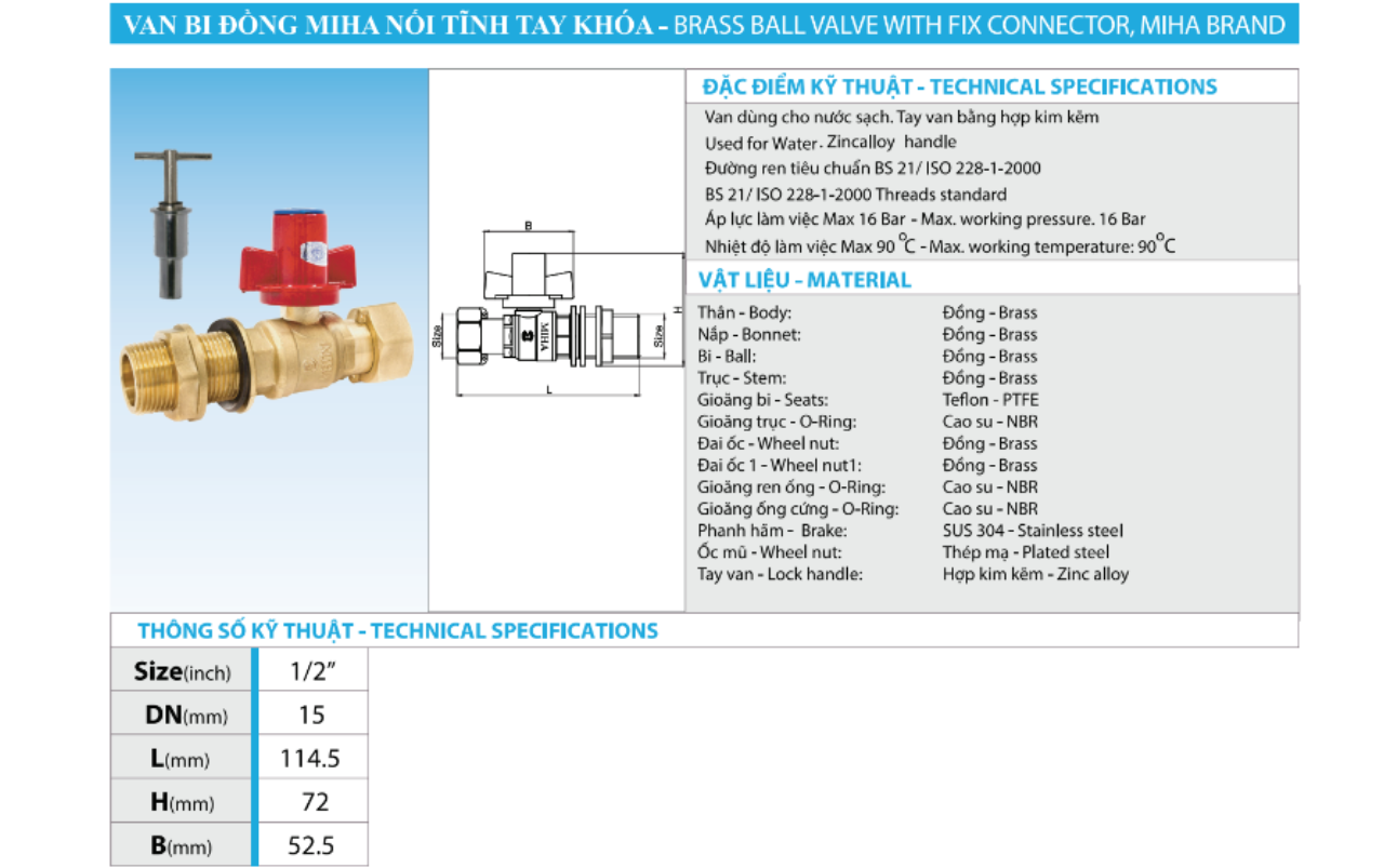Thông số kỹ thuật của van bi đồng MIHA nối tĩnh tay khóa
